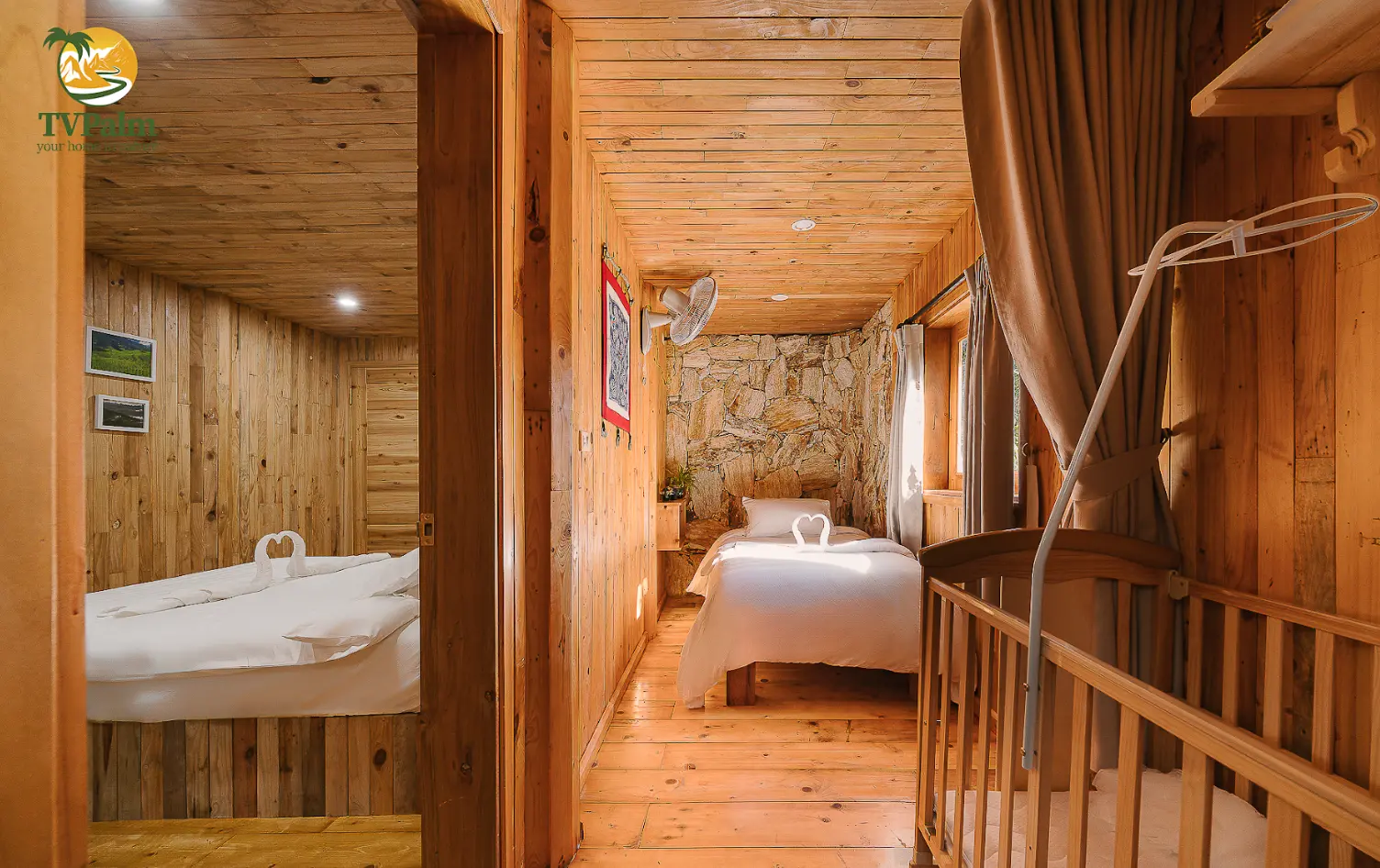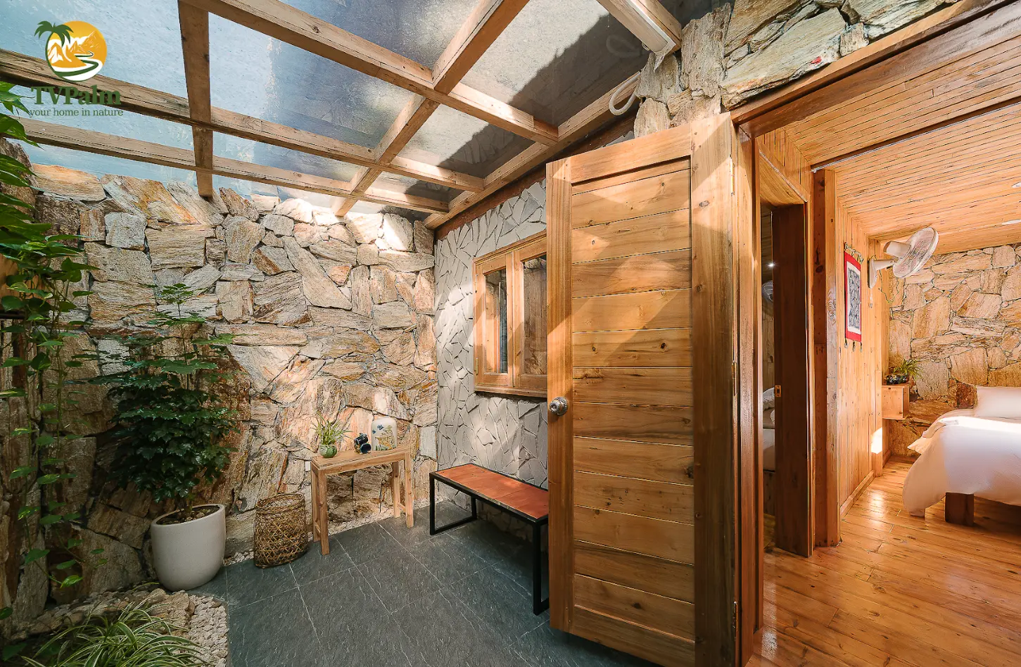 The family room at TVPalm Ecolodge offers a uniquely designed private space, featuring a separate bathroom and toilet. This area is complemented by an outdoor play area that embraces nature, highlighted by wooden, stone, and plant elements that promise to provide relaxation during your stay.