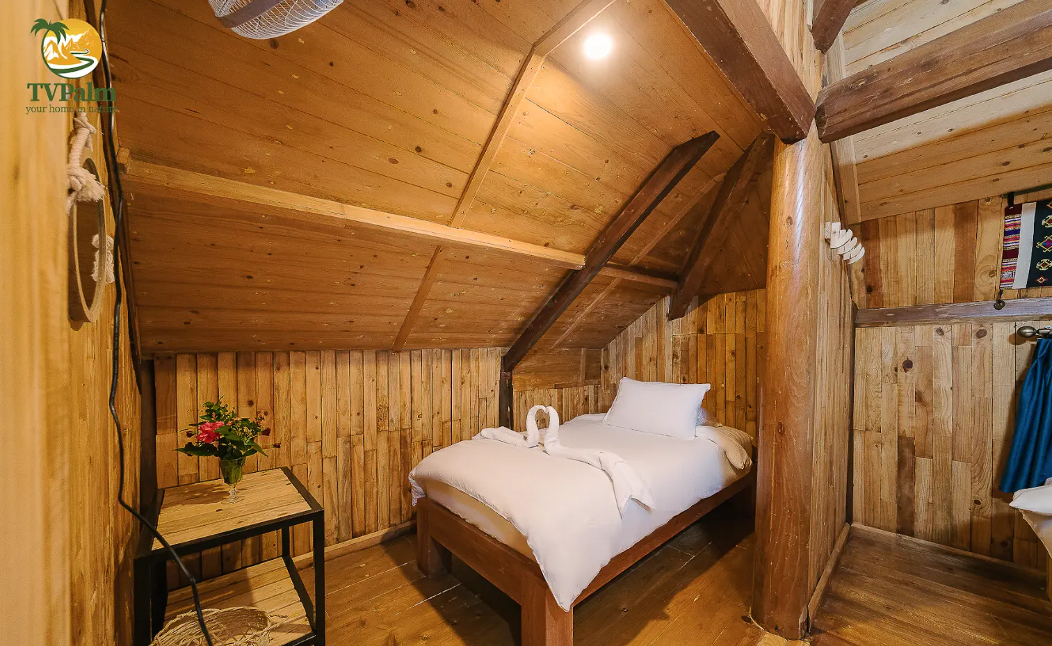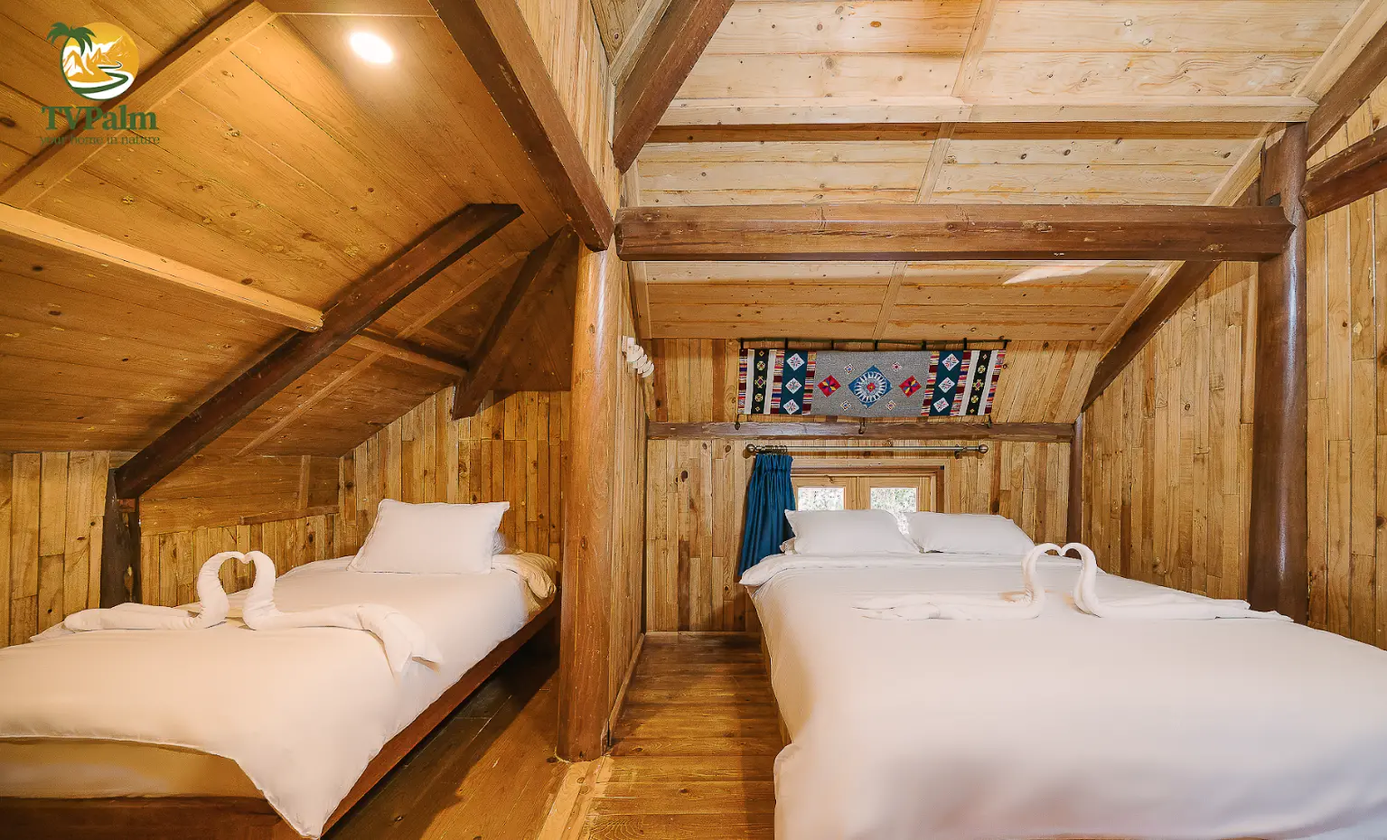 The family room features a spacious king-sized bed measuring 1.6 x 2 meters, along with an additional bed for your little one, sized at 1 x 2 meters. This cozy space is adorned with pine wood furnishings sourced from Germany, creating a warm atmosphere with a pleasant aroma.